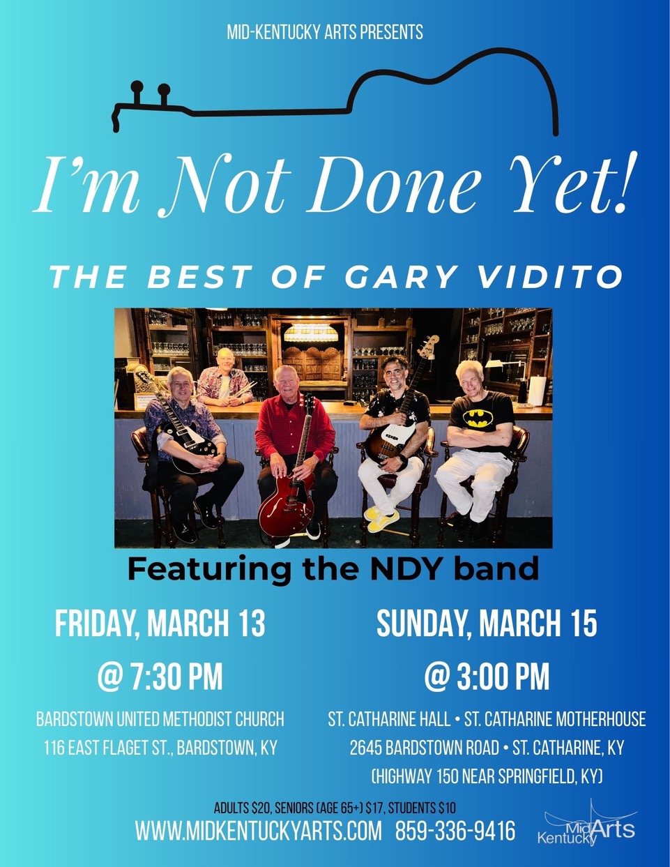 Mid Kentucky Arts presents I’m Not Done Yet! The Best of Gary Vidito in Special Events & Festivals Date March 15, 2026 Time 3:00 pm